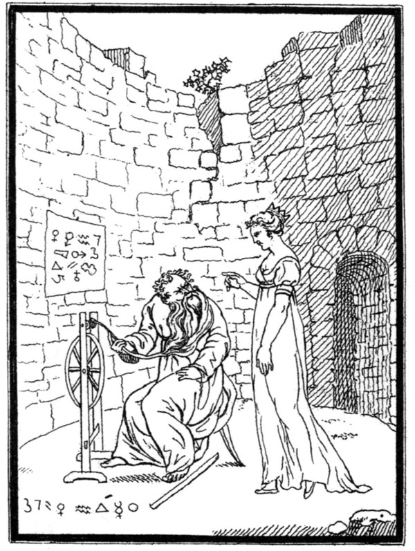 Da sprach der Weise zu den Königstöchtern: »Ihr müßt ziehen in das Reich India. Dort verwahrt ihn eine Fee, genannt Tellus. Ihr müßt aber rein seyn von Lüge und Eigennutz, und viel Wunder müßt ihr ohne Schrecken vernehmen, sonst erringt ihr nie den gesuchten Stein. Folget diesem Vogel!« sprach er, und faßte einen Stein von der Erde, und warf ihn in die Lüfte; und der Stein ward ein grosser Vogel, der langsam voraus flog, und ihm folgten die Königstöchter.