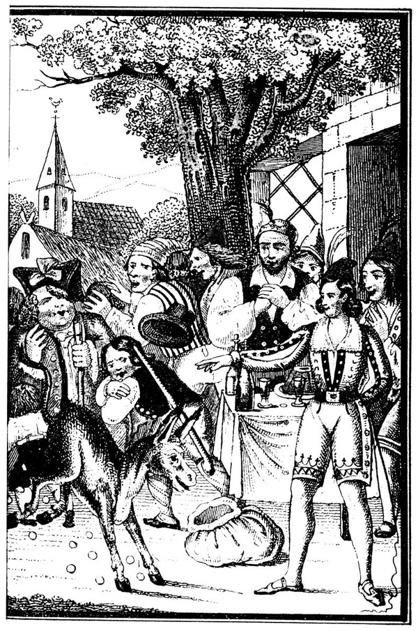 Da zog der Wirth seine weiße baumwollene Mütze ab, und warf sie in die Höhe, daß sie an der Decke des Stalles abfuhr, und drehte sich auf einem Beine herum; und rief: »Juchhei! nun sind wir reiche Leute! nun will ich ein anderes Wirthshaus bauen, als das eins ist, und der Esel darf mir nicht mehr aus dem Stalle!«