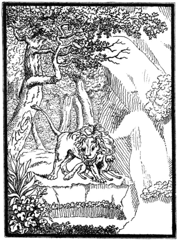 Sie dachten her und dachten hin, und dachten hin und dachten her, die Furcht war groß, und die Hoffnung, die Gefahr abzuwenden, war klein. Sie liefen umher, so traurig und verscheucht. Der Esel senkte seine Ohren rückwärts, der Hase ging gar nicht mehr an's Tageslicht, der Hirsch hielt sich verborgen, das Reh floh, kurz, es war [103] [106]eine Verwirrung unter dem ganzen Thiergeschlechte, so, daß keines mehr seine vorige Fröhlichkeit hatte, seit man gemerkt, daß ein Löwe in der Nähe war.