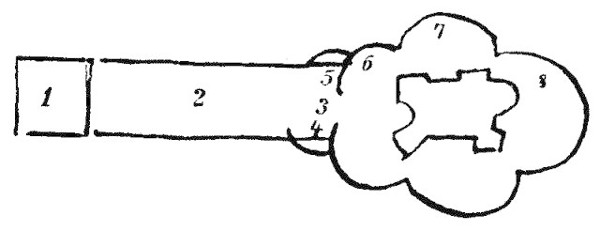 1. Dreyeinigkeit. Riesen mit Camaschen. 2. Avenue Balustrade. Piedestale Vasen Gruppen. 3. Mauer als Festung. 4. Egyptische Figur in der Mauer am Thor. 5. Springbrunn ohne Wasser, Monument zerstreute Vasen. Statuen auf die Nase gelegt. 6. Drachen dazwischen Götter NB. Atlas der ein Weinfaß statt der Weltkugel trägt. Alte Laube vollgestellt NB. Bäncke und Laube vom Onckel her. 7. Spielleute Monster Zwerge. 8. Monster Affen.