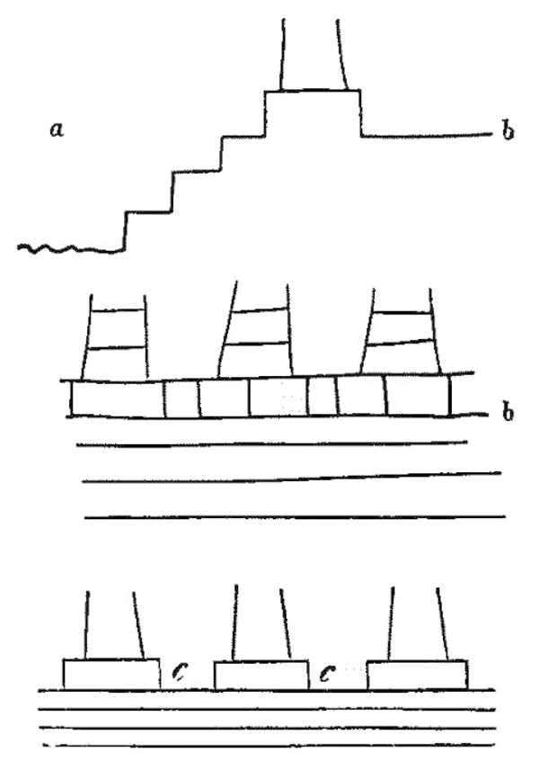 Auf der Mitternachtseite aber sieht es aus als wenn die Säulen Basen hätten, aber es ist die Ursache weil die Steine welche in die Zwischenräume cc. kommen sollten noch nicht eingesetzt sind ausser in einer Säulenweite. Die Vorder und Hinterseite laßen auch ihre Säulen ansehn als wenn sie Basen hätten eigentlich sind aber nur die Stufen ausgeschnitten, und das bleibende Stück sieht aus oder ist eine Base. Es will mir nicht in die Augen, besonders da die zwey obern Stufen ausgeschnitten sind und also die Base doppelt wird.