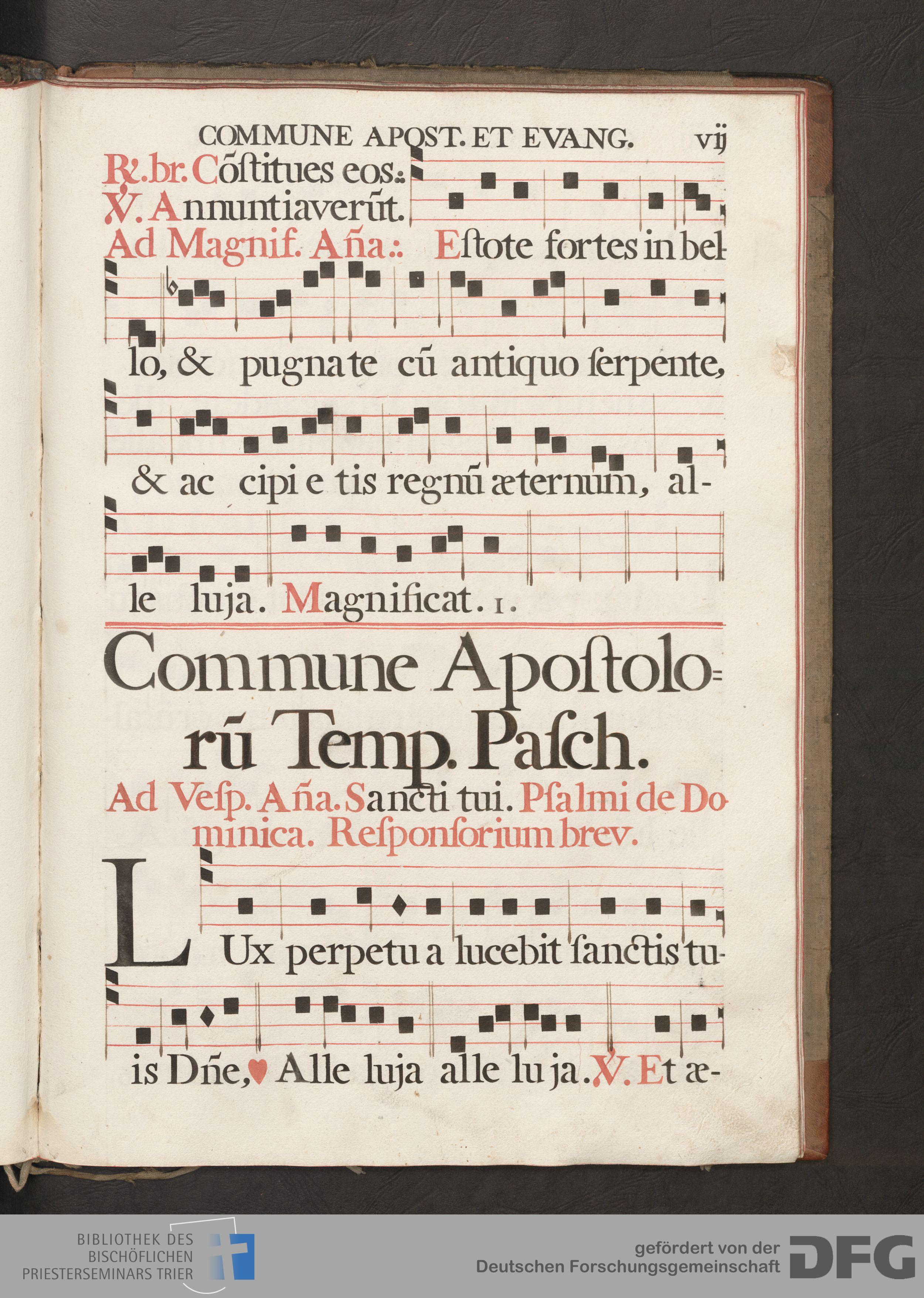 TextGrid Repository (2017). Bibliothek des Bischöflichen Priesterseminars, Hs. 6: Handschrift für den Chor in Schablonentechnik. Inhalte. Bibliothek des Bischöflichen Priesterseminars Trier Hs. 6. Antiphonale Romano-monasticum. Commune sanctorum. Seite 387. Virtuelles Skriptorium St. Matthias. Bibliothek des Bischöflichen Priesterseminars Trier. https://hdl.handle.net/11378/0000-0006-2170-6